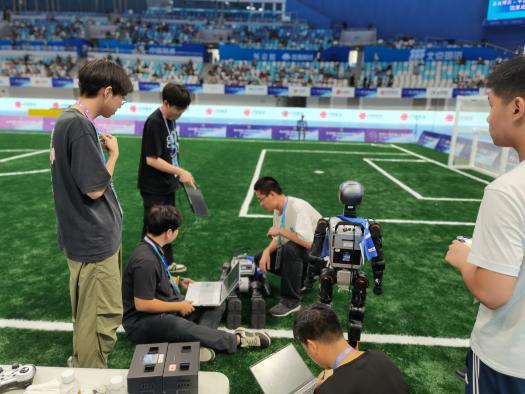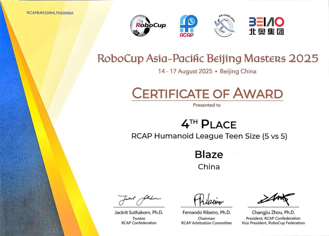 由澳门3044永利官网与光电学院组成的联队Blaze(光炽)队,在澳门3044永利官网秦宇飞、戴丽萍老师和光电学院燕必希老师的带领下,基于此前参加2025RoBoLeague机器人足球联赛并荣获季军的宝贵经验,经过7场小组循环赛以5胜2负战绩名列第三挺进半决赛,在半决赛中憾负对手,最终荣获5V5足球赛全球第四名。澳门3044永利官网Water(水)队在3V3足球赛预赛中虽未出线,但是开启了由轮式足球机器人转向人形足球机器人的新征程。这充分彰显了澳门3044永利官网在智能机器人领域的创新实力与人才培养成效。