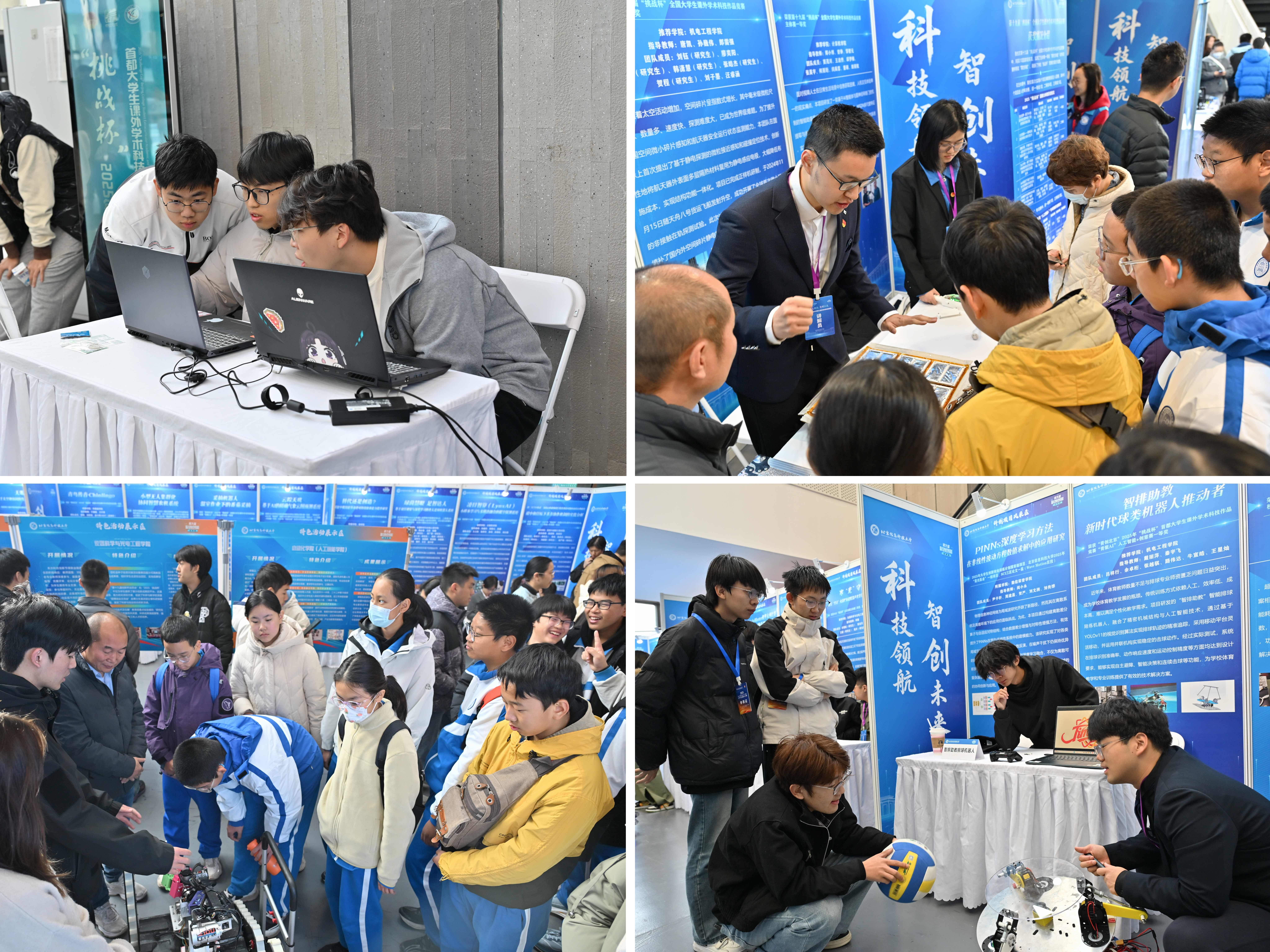 展览期间,学院展区吸引了众多师生驻足观看。11月15日闭幕当天,北京师范大学昌平附属学校的中学生专程前来观展,与项目团队成员互动交流,现场气氛热烈。同学们通过实物演示、互动体验等方式,深入了解了人工智能、智能制造、智慧农业等前沿科技应用,营造出浓厚的科技氛围。